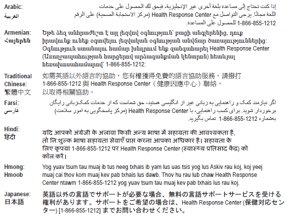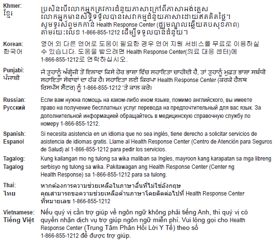 If you require assistance in any language listed below, you have the right to free language assistance services. Please call the Health Response Center at 1-866-855-1212 for assistance.