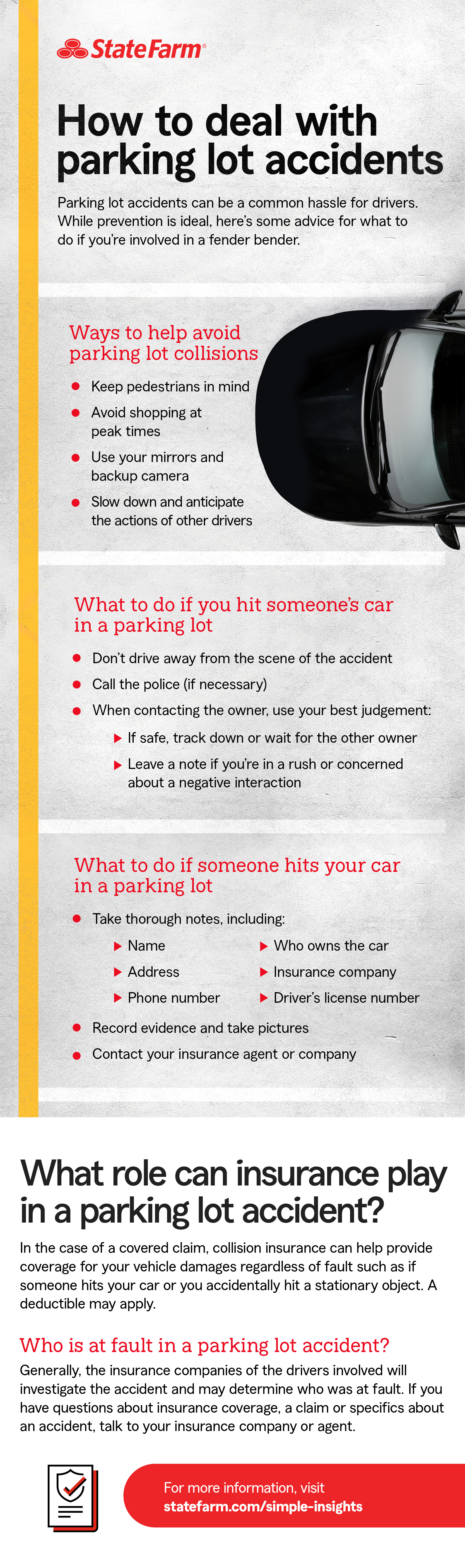 If you're involved in a parking lot crash, follow the same protocol you would for any accident. Remain calm, contact authorities, collect and document information, and contact your insurance agent or company to help you through the claim process.