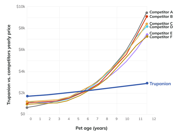Trupanion is unique because Trupanion prices your pet insurance policy based on the expected lifetime care of your pet, only adjusting their rates over time in response to rising costs of veterinary care. This means that if you sign your puppy or kitten up with Trupanion, you will pay the “puppy rate” for as long as you keep your insurance policy. While this often means that Trupanion charges more than other pet insurance providers when you first enroll, the goal is to help you continue to be able to budget for your pet’s health insurance policy well into your pet’s senior years, when you are more likely going to need to use your insurance. Below is an illustrative example of how this could look: